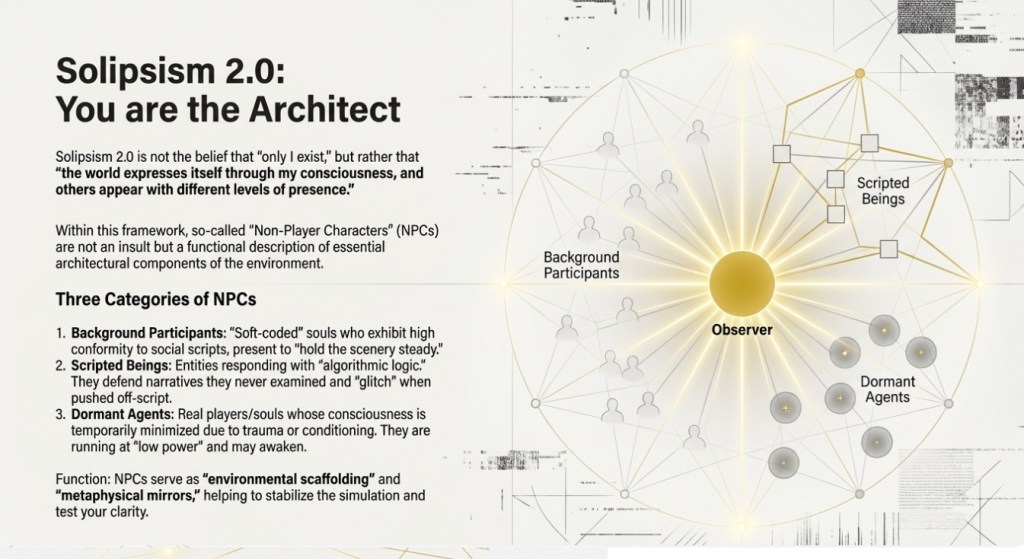 In simulation theory, an NPC — a Non-Player Character — is not an insult but a functional description. It refers to entities that appear conscious but operate with constrained behavioral complexity. If a Solipsism 2.0 framework is correct (where consciousness partially generates the rendered world), then “NPCs” aren’t glitches of society — they are architectural components of the environment.